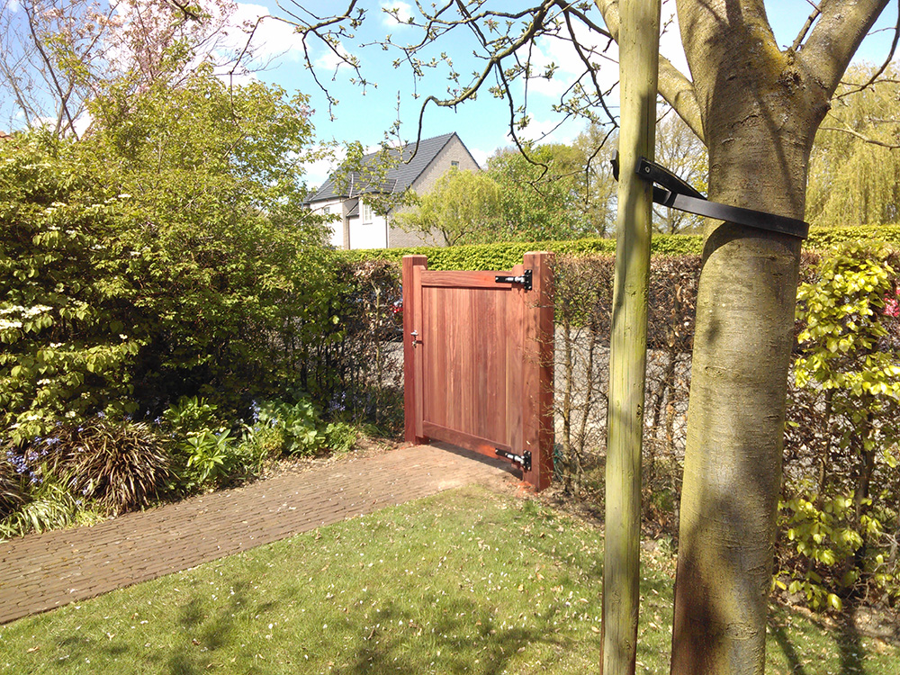 De doorsteekomheining in geschaafd hardhout behoeft geen behandeling en krijgt na verloop van tijd een mooie, grijze patine